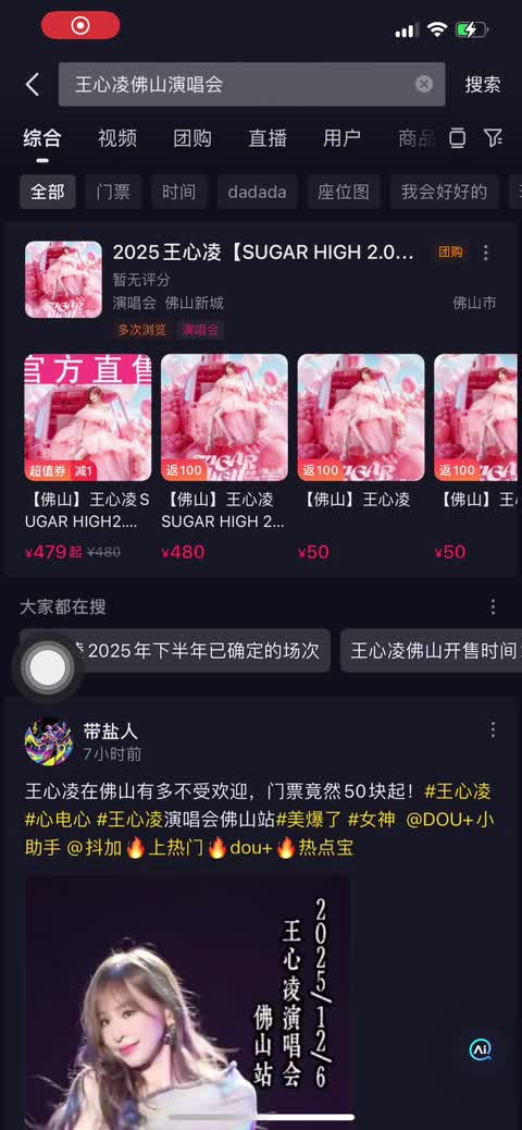 抖音上刷到王心凌佛山演唱会,出现门票价格50起,然后就点进去看了。 其他两个480元起...