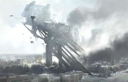 在末尾,这支预告片为我们亮出了国际版片名《World Invasion: Battle Los Angeles(暂译,全球入侵:洛杉矶之战)》,同时也揭示出了一个新的官网地址:WorldInvasionBattleLA.net。进入这个站点后,你会看到一个Flash,展示出浓烟滚滚的洛杉矶废墟中,矗立着一个巨大的机械物体,周围环绕着多个外星飞行器,如下图: