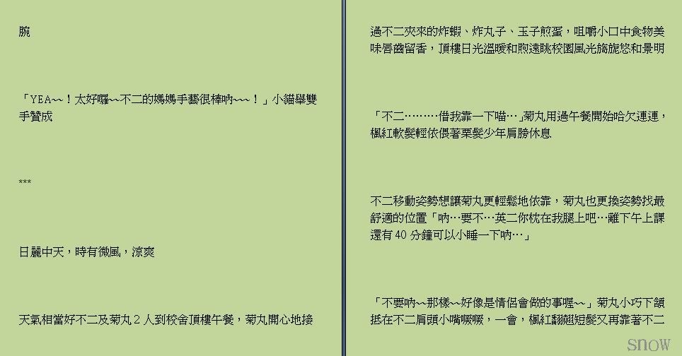 「打钟了,不二掰掰~~记得中午一起吃饭呐喵~~」 红色身影跑带跳地步出3班教室