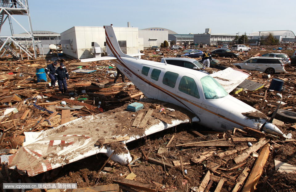 3月14日,宫城县岩沼市,一架飞机半埋在废墟中