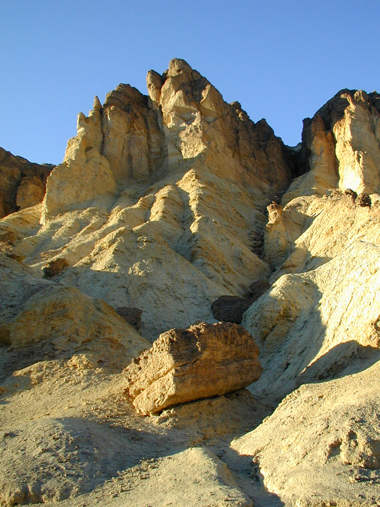 Golden Canyon还挺不错的,挺宽的 (比Mosaic Canyon要宽多了),中间地面上有一个明显的古河床,岩石是土黄色,有些石头太阳一照还发光,我们还开玩笑会不会有金子藏在里面。Canyon边上的岩石不太陡,有的可以爬上去。 我们忙着玩,想着等回来时再拍照。。