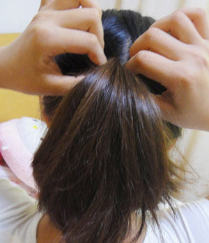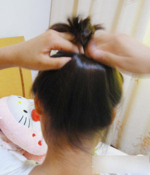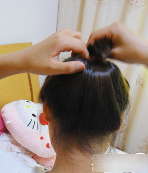 第二步:在皮筋以上的头发用手指挖出个小洞,这样后面的头发才能塞进去哈.