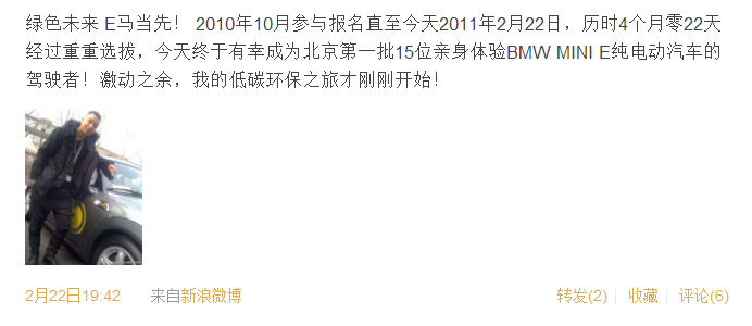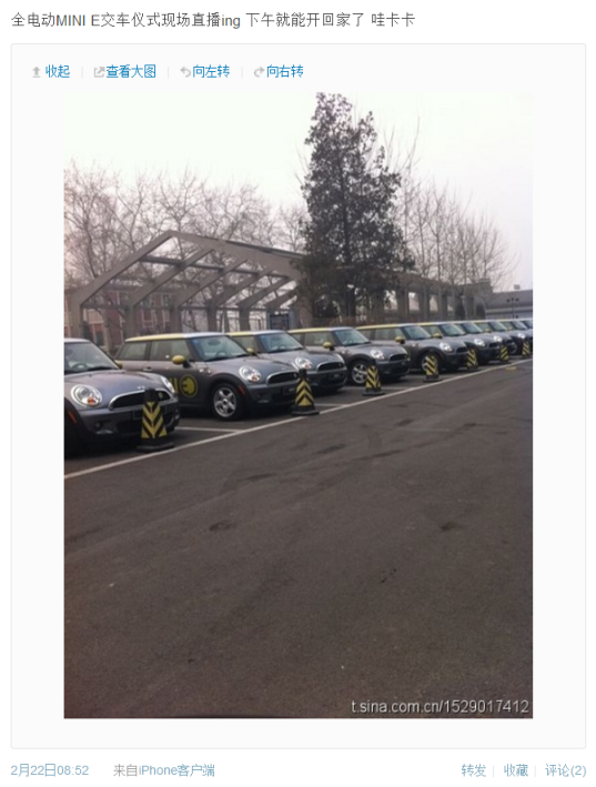 2月22日,北京首批MINI E路试用户交车。这是全国第一批开始MINI E实路测试的用户,新鲜的充电桩,新鲜的驾驶方式,一切都令人充满期待。