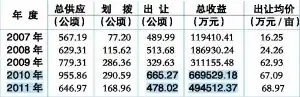 从兰州市国土资源局相关部门获得2007年至2011年5年间,兰州市土地出让面积和出让收益的权威数据显示: ●2007年至2010年:兰州市出让土地收益翻倍增长,土地市场活跃。如:2007年至2010年兰州市出让建设用地面积分别为489.99公顷、513.68公顷、329.63公顷、665.27公顷;收益分别为11.94亿元、18.69亿元、31.12亿元、66.95亿元,换算后即每亩单价分别为16.25万元/亩、24.26万元/亩、 62.93万元/亩、67.09万元/亩,呈逐年上升趋势。 ● 2011年:兰州市土地出让出现较大回落,共出让建设用地478.02公顷,相比2010年减少187.25公顷,土地收益49.45亿元,相比2010年减少17.5亿元。