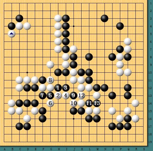 图四,党毅飞手软。黑1-3明显手软,白棋6-10位先手吃掉黑1子,黑11后手活但确保右边白棋没眼。此时白棋正确下法是直接12位飞,强调黑棋的弱点,同时还能防止对方L2-K2的手段,如此黑棋想杀白棋谈何容易。