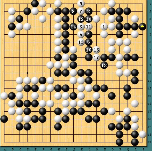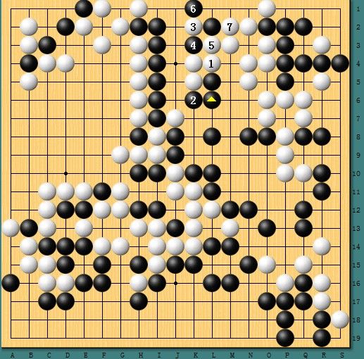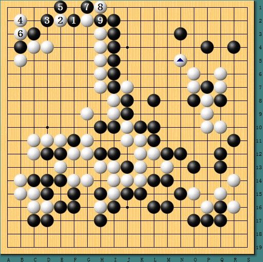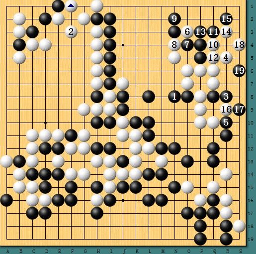 图二,天外来客。左上方白阵一眼望去原本已经是白茫茫的铁桶阵,然而党毅飞利用左上角的味道祭出1位靠的妙手,犹如一位天外来客,最后竟强行在一路作出劫争,黑棋几乎毫无负担,这也给后面的攻杀创造了契机。