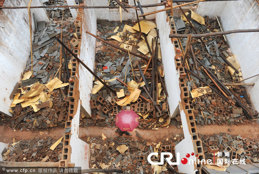 2012年4月25日,湖南株洲市炎帝大道,王杨民家的房子已经成了一片废墟,客厅厨房已经被红砖泥土掩埋。本是房屋内的过道已经变成了村民出行的公共道路。 国际在线消息:2012年4月24日下午4点左右,湖南省株洲市天元区遭到强风暴雨袭击,导致大量建筑物倒塌,人员受伤。其中,群丰、马家河两个乡镇受灾最为严重,一些社区村组半数房屋倒塌。目前,当地政府正抓紧抢险救灾,财物损失和人员伤亡尚在统计中。