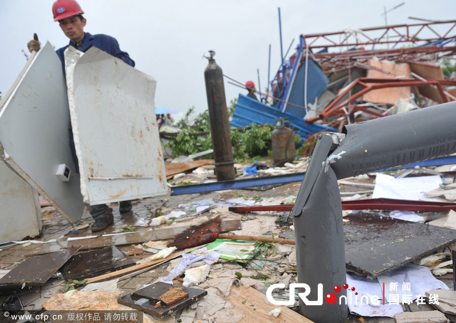 2012年4月25日,湖南株洲市炎帝大道旁的一栋临时施工楼被大风刮塌,一名工人正在清理现场。