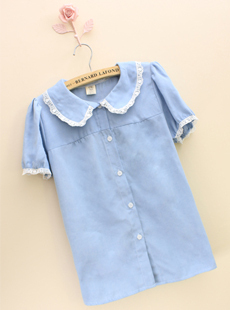 实拍2012韩版复古风蕾丝花边娃娃领泡泡袖牛仔衬衫短袖衬衣