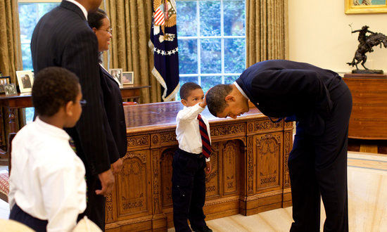 当时,雅各布告诉奥巴马说,“我想知道我的头发是否和你的一样。”奥巴马要他再说一遍。贾克布重复了之后,奥巴马回答说,“你为何不摸摸并自己看看?”他低下头,到贾克布面前,贾克布迟疑了。奥巴马说,“摸啊。”贾克布拍拍奥巴马的头顶。摄影师抓拍下了这个瞬间。奥巴马问他,“你觉得如何?”贾克布说,“对,它感觉是一样的。”