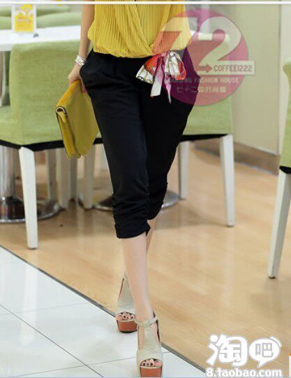 解释:长度停留在膝盖或小腿的七分裤,十分适合个子娇小腿细的MM,对修饰比例有神奇效果。