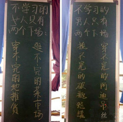 “不学习的女人只有两个下场:逛不完的菜市场,穿不完的地摊货。不学习的男人只有两个下场:穿不完的阿迪吊丝,捡不完的破瓶烂罐。”由网友“@丁灏轩”晒出的班级励志标语,自8月22日现身网络以来,引发网友如下热议: