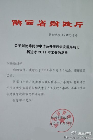 陕西财政厅:杨达才工资不属于其信息公开范围