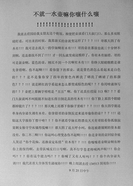 【水壶姐网络爆红】一则名为《大四学姐的壶你也敢偷》的启事,在网上红透了半边天。从网友贴出的照片里可以看出,这则启事写在9月21日的晚上