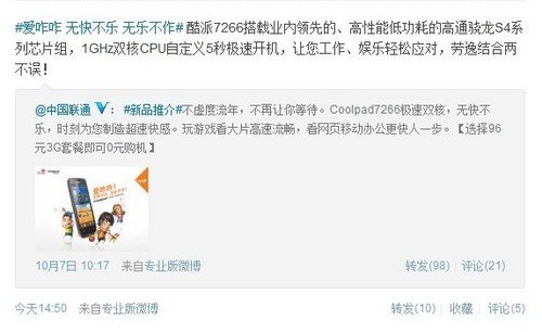 酷派7266 从中国联通的官方消息来看,中国联通定制版酷派7266提供给用户多种合约购机计划,其中选择96元3G套餐便可0元购机,使得本身就非常具有性价比的酷派7266更吸引人。