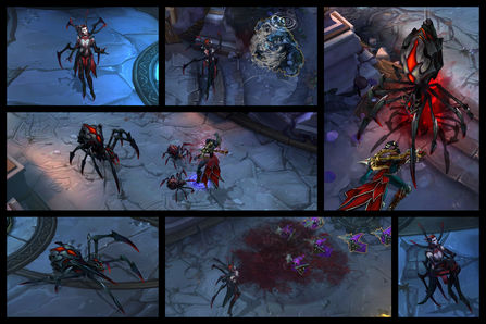 · 蜘蛛形态:艾丽兹变身为一个可怕的蜘蛛,刷新所有技能。蜘蛛形态的艾丽兹可造成附加伤害并提升移动速度,提高物理和魔法防御能力。每提升一级,艾丽兹的终极技能可召唤更多的蜘蛛。