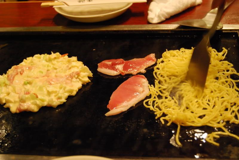 先煎一部份的粉团, 肉 + 面分开煮熟, 之后再把肉+面放到粉团上, 再把余下的粉团放在上