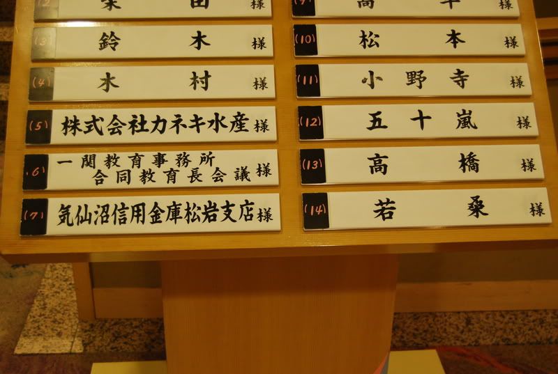 会场外有指示牌说出今晚吃饭人客的名牌, 估不到我与木村, 松本一起吃饭啊