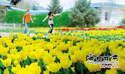 一对年轻人在兰州植物园盛开的郁金香中嬉戏