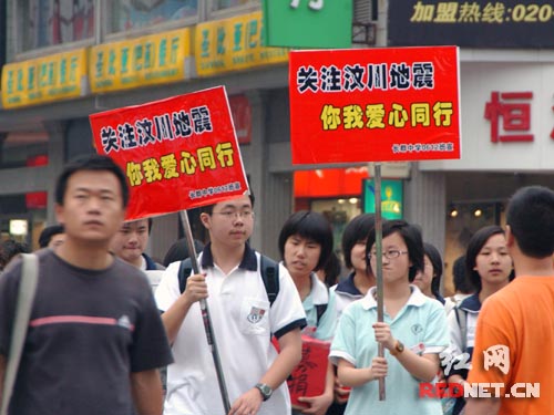 一些学生在黄兴路步行街上号召市民为灾区捐款