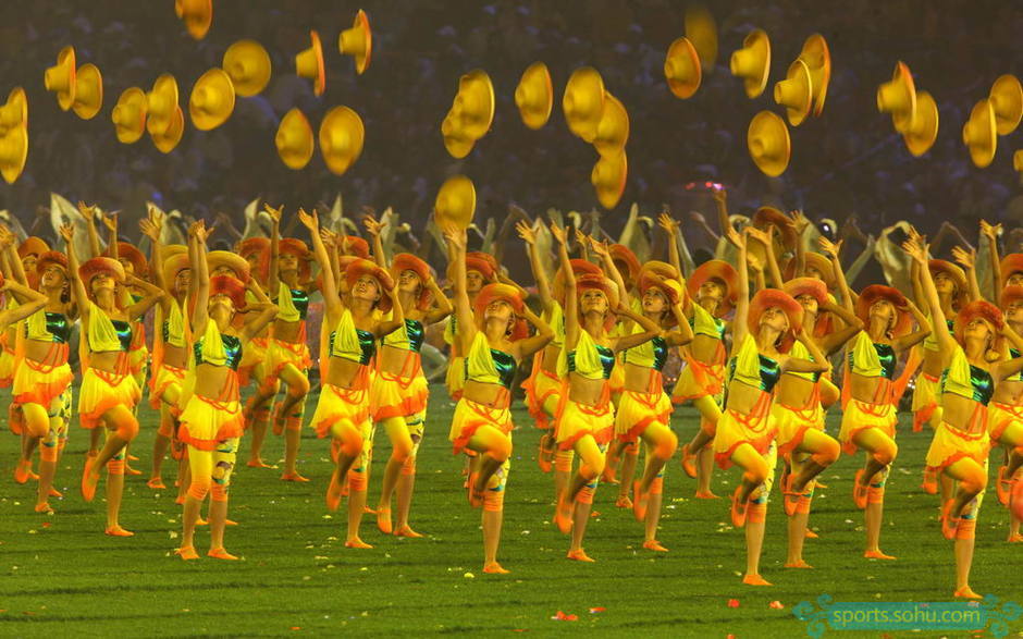 有耕耘就有收获,有收获就有欢乐。在欢快、活泼、奔放的音乐声中,草地上飞起一项项金色的草帽。草帽在阳光般的少男少女们的手中相互传递者,他们传递着真诚的祝福,传递着美好的理想。金色的草帽如同金色的梦想,在天空中飞旋,在大地上飞舞。