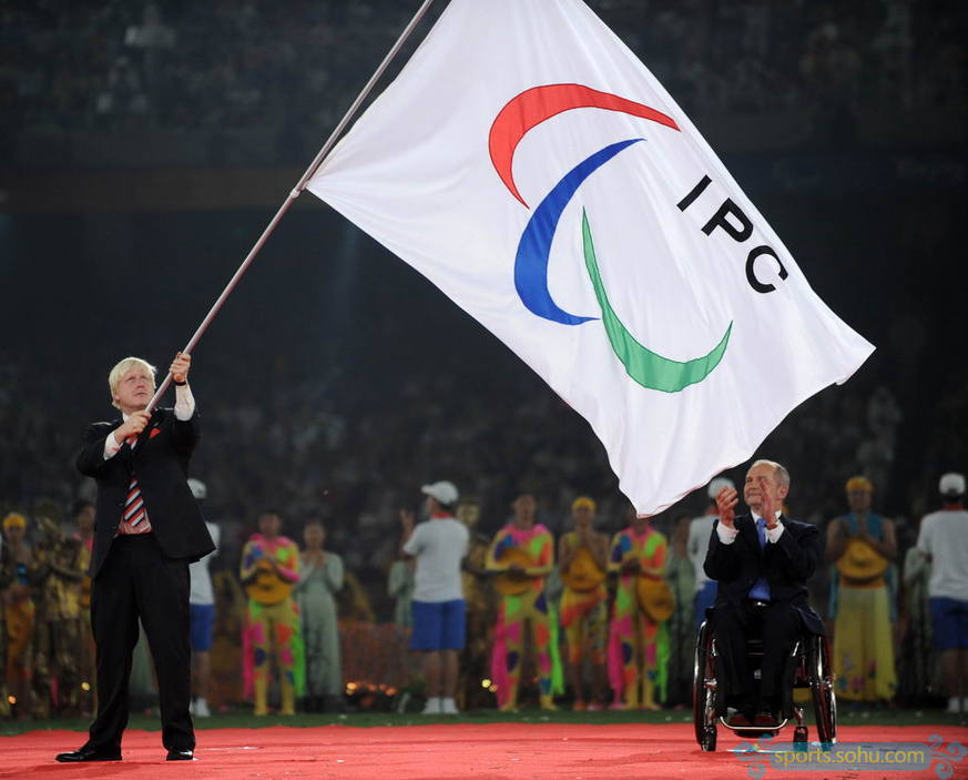 伦敦市shi 长约翰逊在交接旗仪式上挥舞国际残奥委会会旗。