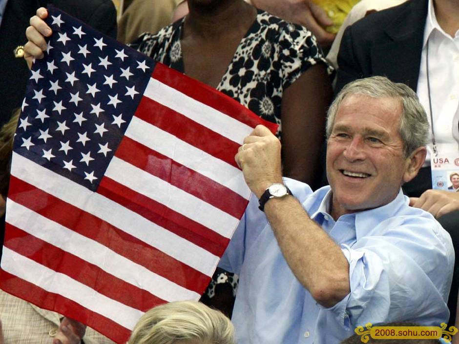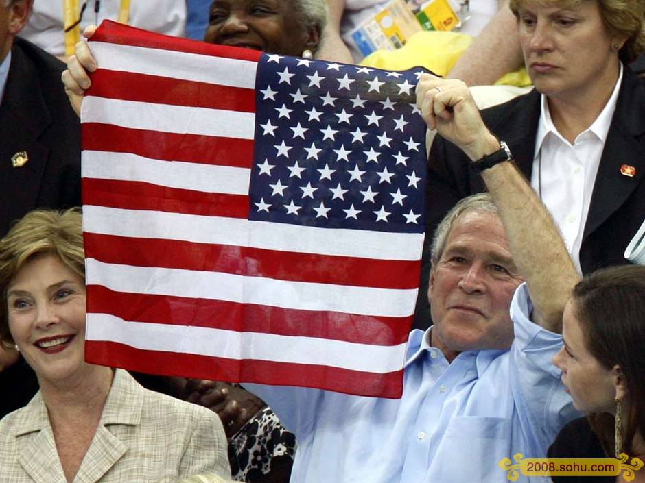 8月10日,美国名将菲尔普斯获得了男子400米混合泳金牌,并打破世界纪录。布什现场为菲尔普斯摇旗呐喊