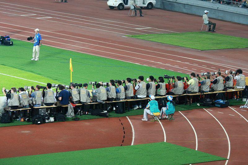 完全是信手一捏,不过是因为巨额的摄影记者跟我们观众席一样那么挤啊!也坐的这么整齐,数一下佳能的白镜头数量,在这一排记者中占到了七八成的比例呢,基本上在体育摄影领域,市场份额差不多也这样的