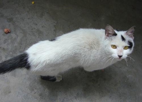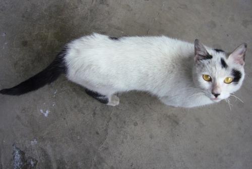 结果上楼的时候那只猫咪还真还在那 我好高兴的 马上把火腿肠喂给它吃 结果它闻了闻 没吃 我想 这猫不至于这么挑嘴吧 连这个都不吃啊 但是猫猫只是闻闻我 绕着我转了一圈