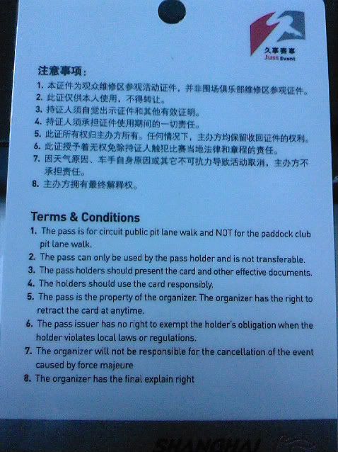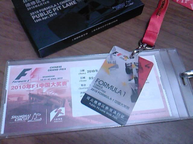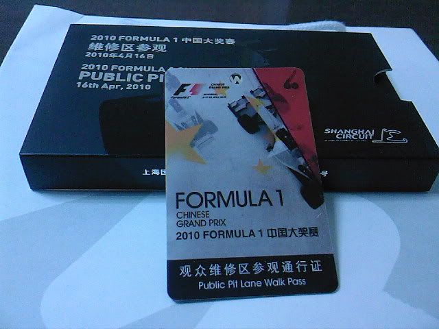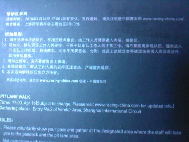 本来偶还幻想至少可以在PIT出口的地方走走,拍下照之类的,看起来有点困难了。近距离的摸一下赛车也不太可能了。看机会吧,如果有可能的话。