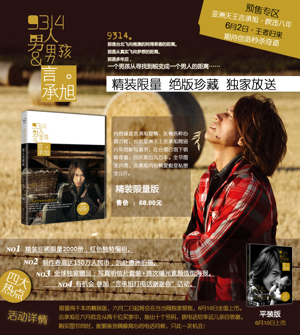 9314男人与男孩(精装限量版)(附赠独家超值礼:言承旭素颜海报+言承旭独家明信片套装)(亚洲天王言承旭睽违8年,重金出击,魅力四射最新力作,内心情爱蜕变私密全公开)(6月10日上市,敬请期待) 预售商品