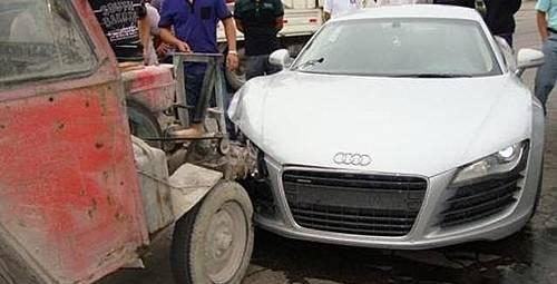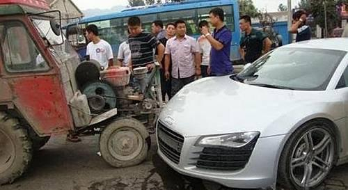 近日,一辆还没来得及上牌照的奥迪R8与一辆农用拖拉机迎面相撞。R8的右前部严重受损。在场的所有人都为之哗然,看来这拖拉机也要借着奥迪R8火一把了。
