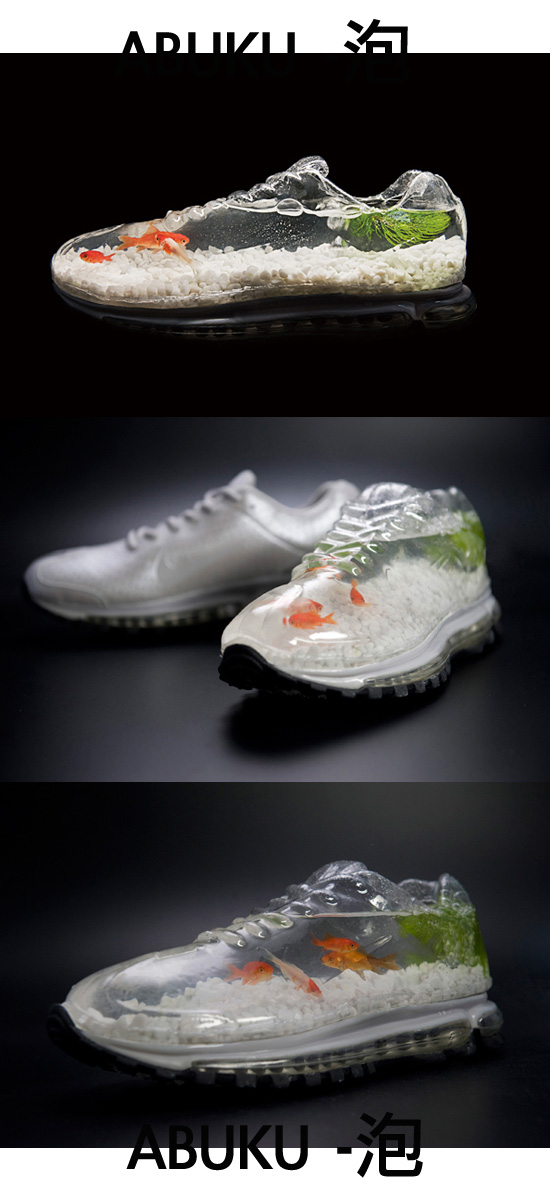 London Design Festival 2010 其中一个名为Nike 78的项目,请来环球七十八个设计单位参与,一起挑战设计的可能,芸芸球鞋再造之中,最吸引眼球必数日本的团队 wieden + kennedy tokyo LAB 无疑,AIR MAX 360化为名《ABUKU -泡》,还养了数尾金鱼。