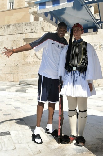 美国男篮刚刚到达希腊,杜兰特调皮的凑上去和希腊一个普通的议会卫兵合影